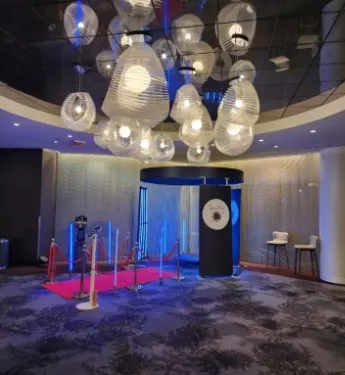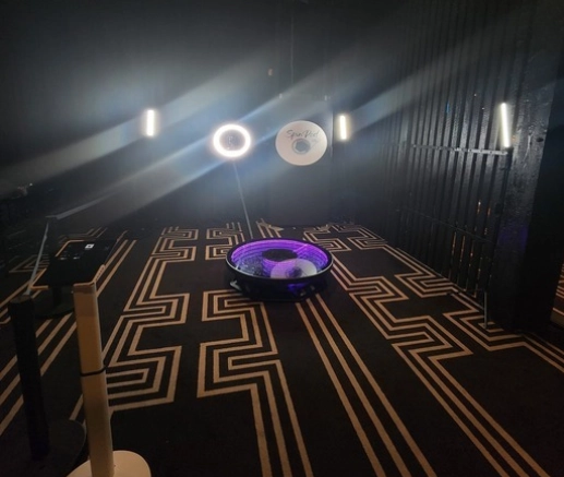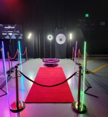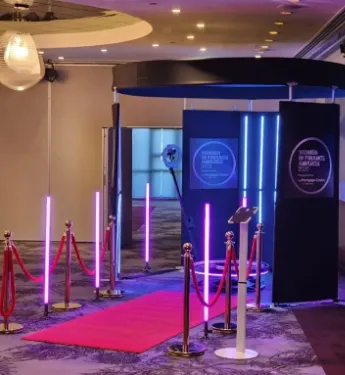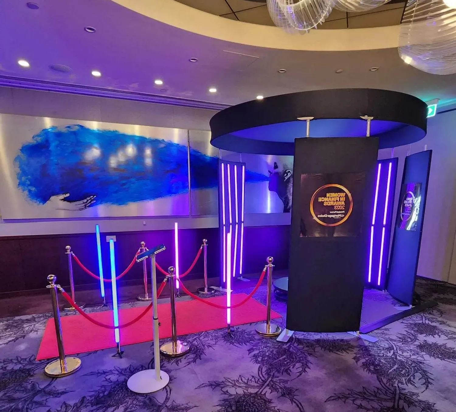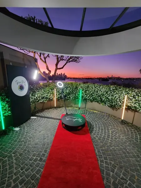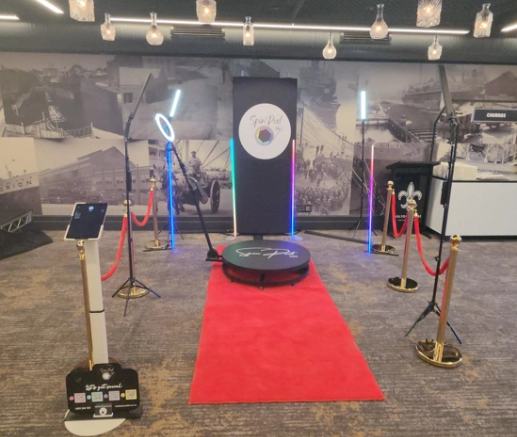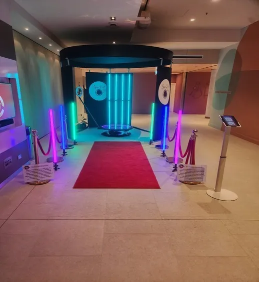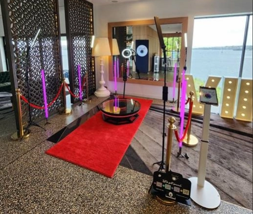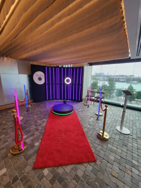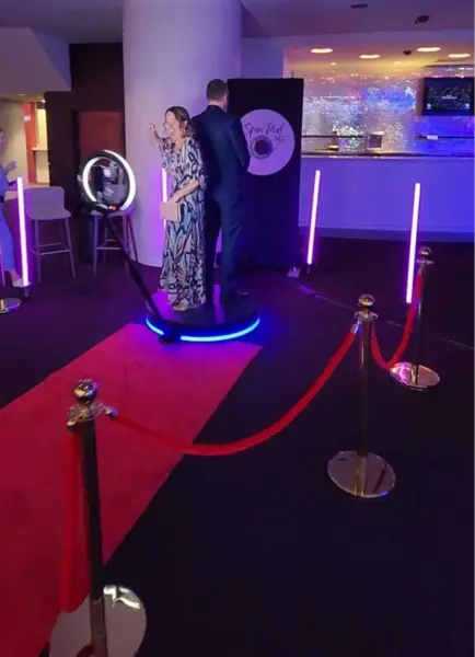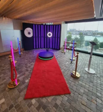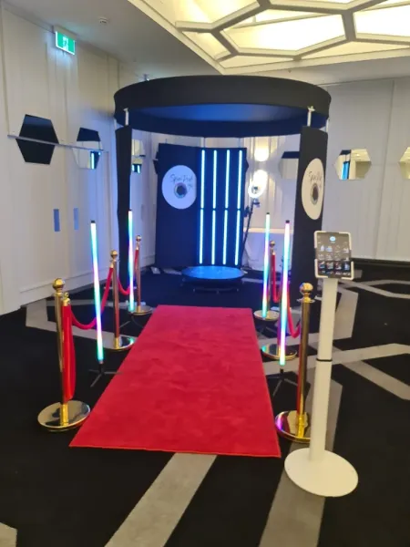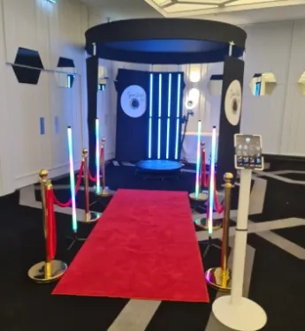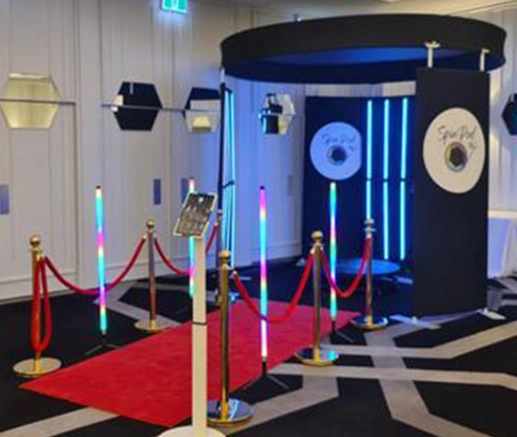Glam set up (red carpet, photo shoot LED lighting, velvet stanchions) with unique SpinPod HUB or LED backdrop, that provides a partially enclosed ‘booth’ with RGB LED backdrops.