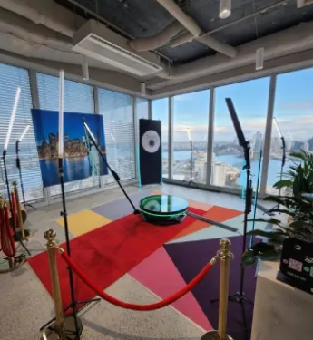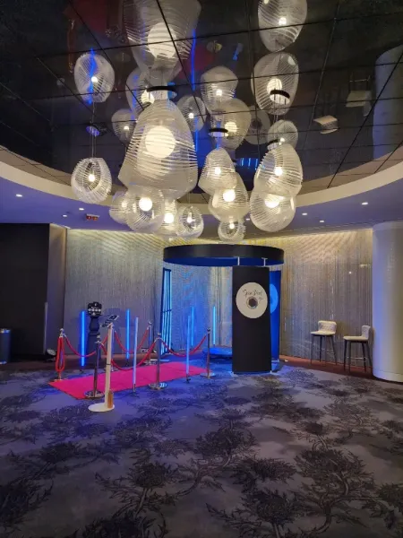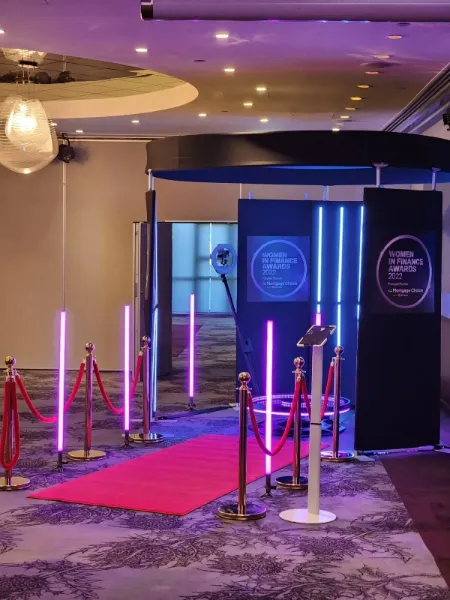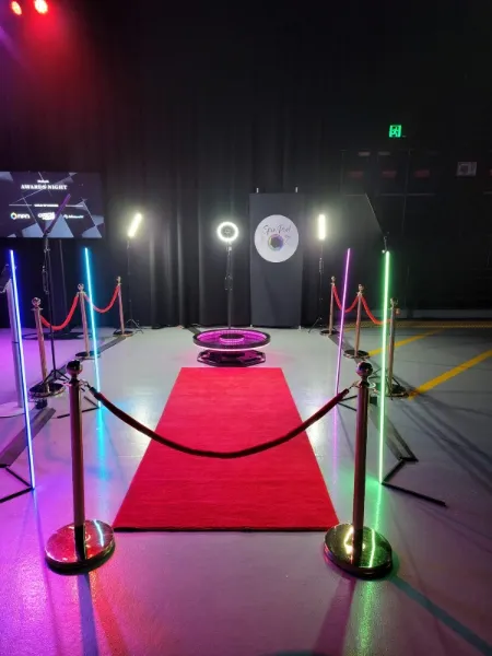 Glam set up (red carpet, photo shoot LED lighting, velvet stanchions) with unique SpinPod HUB or LED backdrop, that provides a partially enclosed ‘booth’ with RGB LED backdrops.